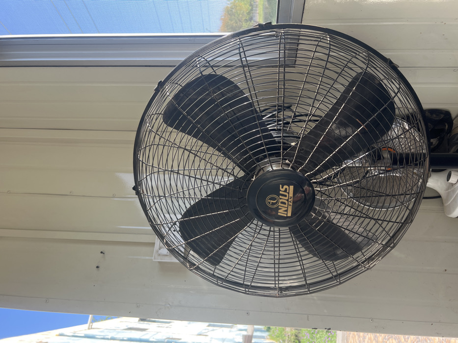 A black "INDUS FAN" branded pedestal fan, featuring a protective wire grille and four static blades, is centrally positioned in a semi-enclosed space