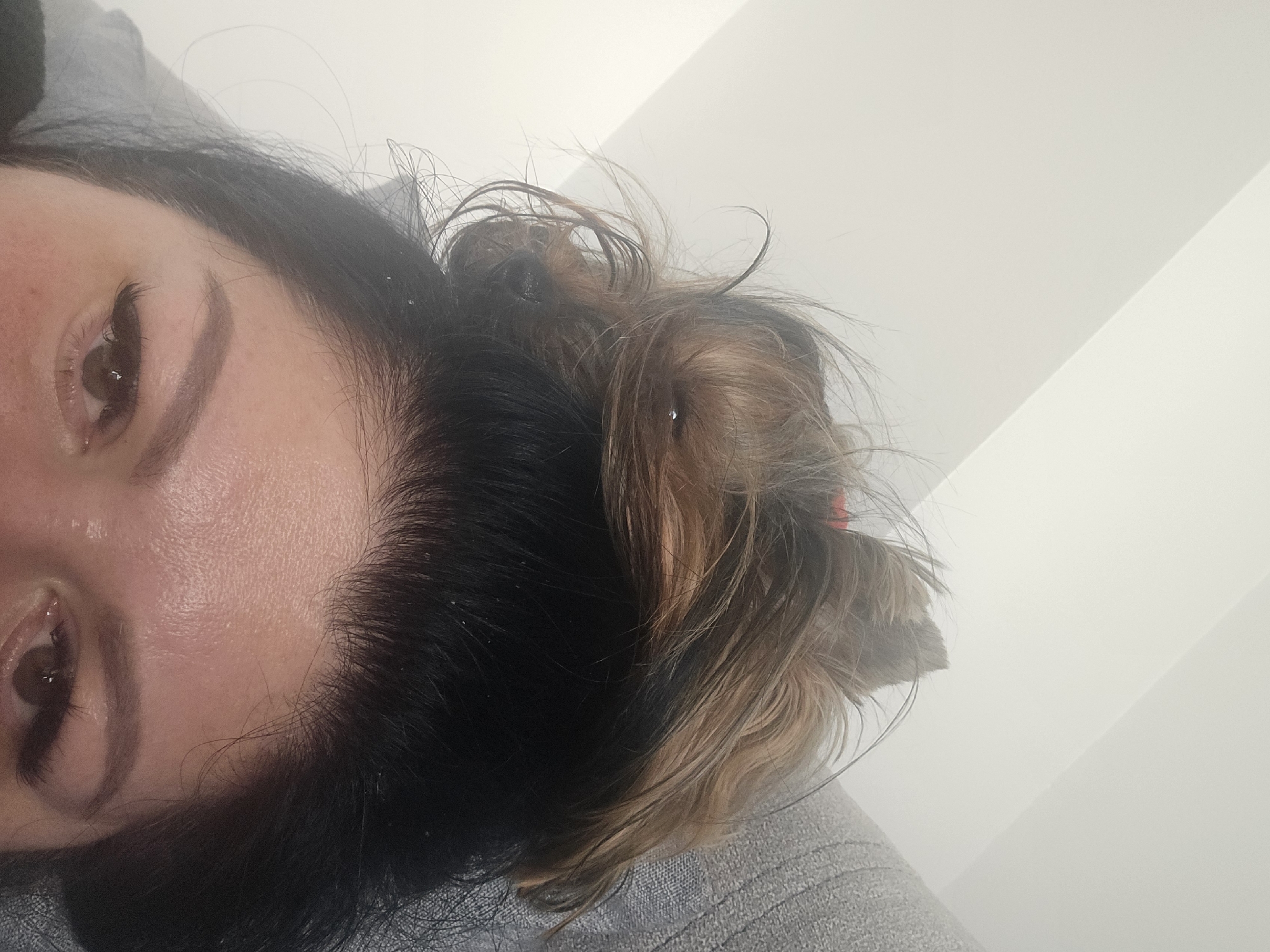 The image displays an upward-angle indoor shot capturing the upper portion of a female subject's face and a small animal. The female subject, appearing to be reclining, has dark brown or black hair. Her eyes are open, dark brown in color, and feature noticeable dark eyeliner or mascara and extended eyelashes. Her eyebrows are well-defined and appear groomed. Her forehead shows slight texture. Resting directly atop her head, intermingled with her hair, is a small, light brown and dark-furred animal, consistent with a dog of a terrier type, with upright, pointed ears. The animal appears to be stationary. The background consists of a plain, light-colored wall with a diagonal shadow line in the upper left, and a textured grey fabric surface, likely a cushion or part of a piece of furniture, on the right. The specific location within the city of Varna, Bulgaria, cannot be determined from the visual information provided in the image.
