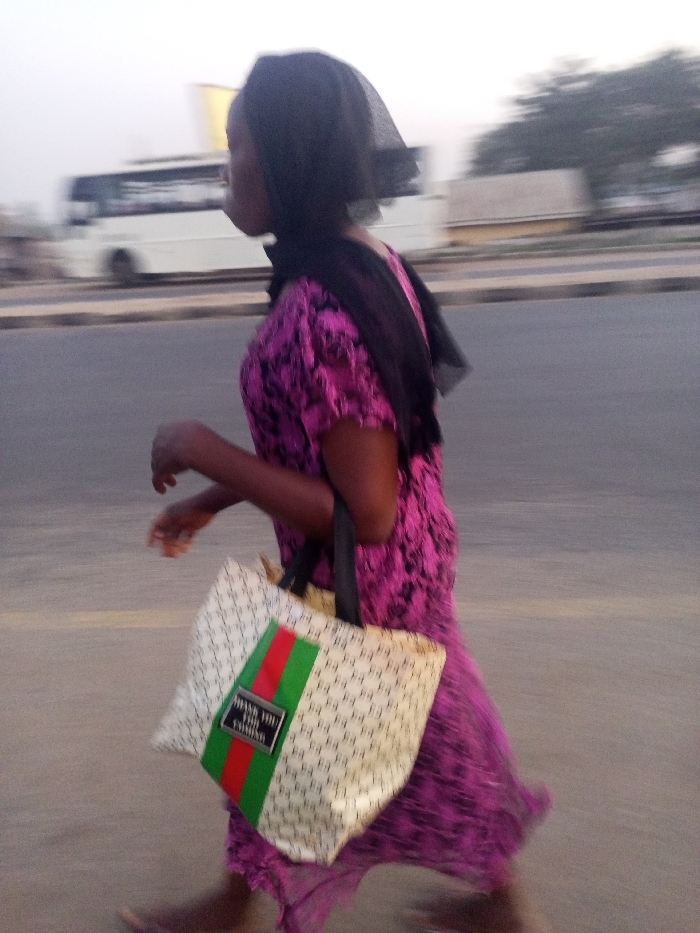A woman wearing a purple dress, black headscarf, and carrying a cream-colored tote bag with a green and red stripe walks along a road