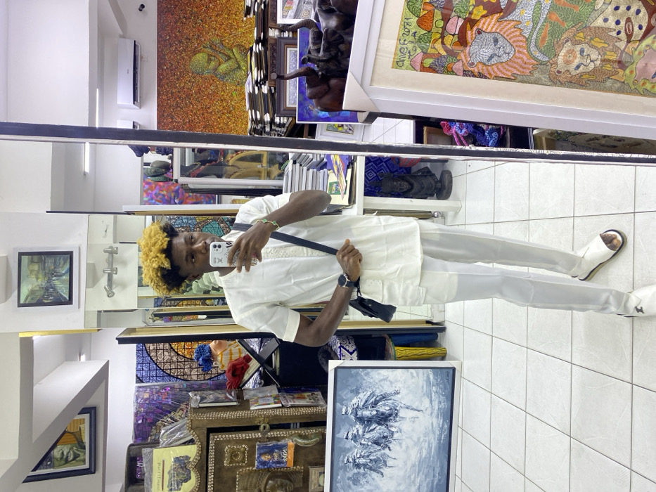 An adult male stands inside an art gallery or shop in Ikate, Nigeria, taking a mirror selfie