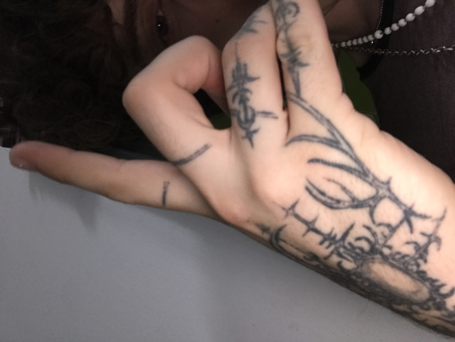 A fair-skinned hand displays extensive black line tattoos. The intricate designs cover the wrist and extend to the knuckles, resembling barbed wire and stylized symbols. The thumb and forefinger form a circle, while other fingers extend. Part of a person's head is visible with curly dark hair, as well as a beaded necklace around their neck. A brown shirt is also visible and the background is a light-gray surface.