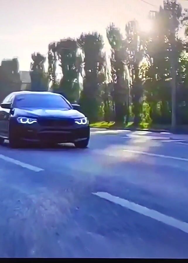 dark-colored BMW sedan doing a burnout on a city street. The car is facing the camera and is in the middle of a crosswalk at first. Then it is driving along a wide road with trees lining the sides. Smoke is coming from the tires as the car accelerates. The sky is bright and the sun is shining. Other cars are visible in the distance. Music is playing.