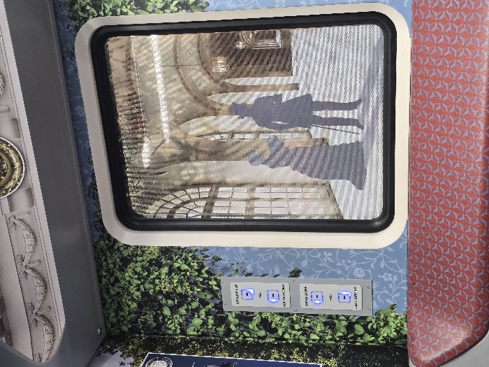 The image depicts the interior of a subway car in Saint Petersburg, Russia. The scene is illuminated by overhead light, casting soft shadows. The upper wall section is light grey with decorative white plaster molding featuring acanthus leaf motifs and a central gilded roundel. Below this, the wall transitions to a green ivy pattern on the left, moving into a light blue wallpaper with a delicate white floral and vine pattern. A large, vertical rectangular window with rounded corners is centrally framed in cream, sealed with black rubber. This window displays an illuminated interior scene: a long, grand hall or gallery with tall arched windows on the left and a vaulted ceiling supported by columns, creating deep perspective. Two dark, opaque silhouettes of individuals are present within this scene. The figure on the left is female, wearing a long dress. The figure on the right is male, dressed in a long coat and top hat, holding a walking stick in his right hand. Both figures face away from the viewer, positioned centrally within the hall. Horizontal striations are visible across the entire displayed scene within the window. To the left of the window, a vertical panel with four rectangular buttons, each illuminated blue, is mounted on the blue patterned wall. The bottom of the frame shows the top portion of a red patterned seat, featuring a repeating light blue geometric design.