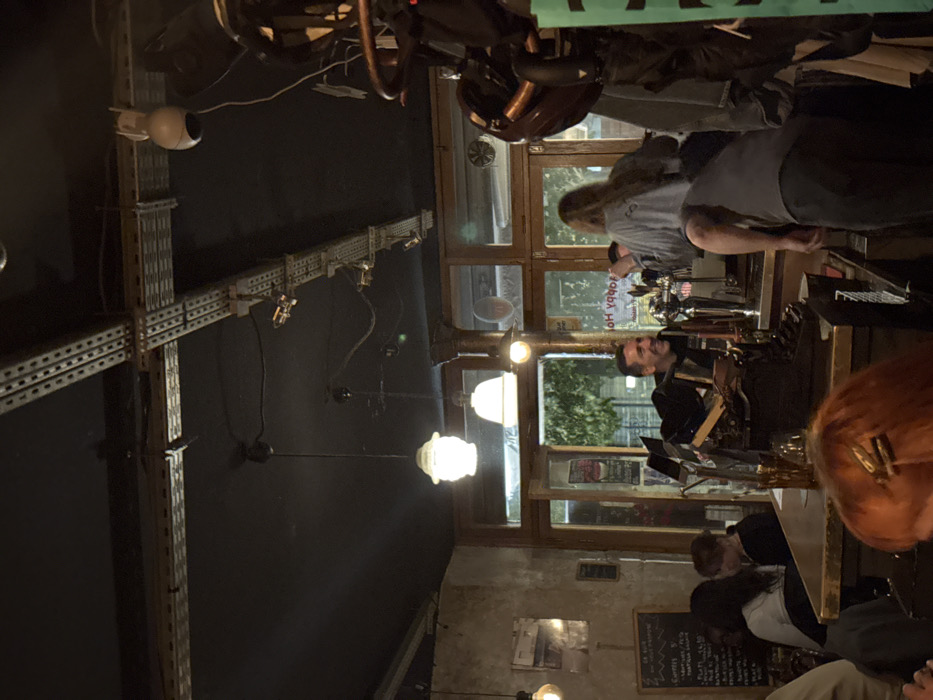 The image depicts the interior of an establishment, identified as being in Paris, France, characterized by dim, warm lighting