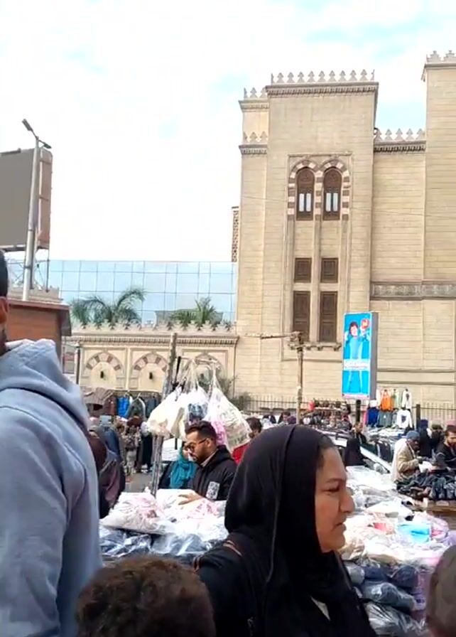 The video depicts a bustling outdoor market scene, likely in a Middle Eastern or North African country, given the architecture and clothing of the people. The market appears crowded with shoppers browsing goods displayed on tables and blankets. The merchandise includes clothing, sunglasses, and other items. Several men are visible examining the wares, while women wearing hijabs are also browsing. In the background, a large, ornately decorated building resembling a mosque stands tall. A large billboard is to the left of the building. The sky is partly cloudy. The camera moves slightly, providing different perspectives of the scene.