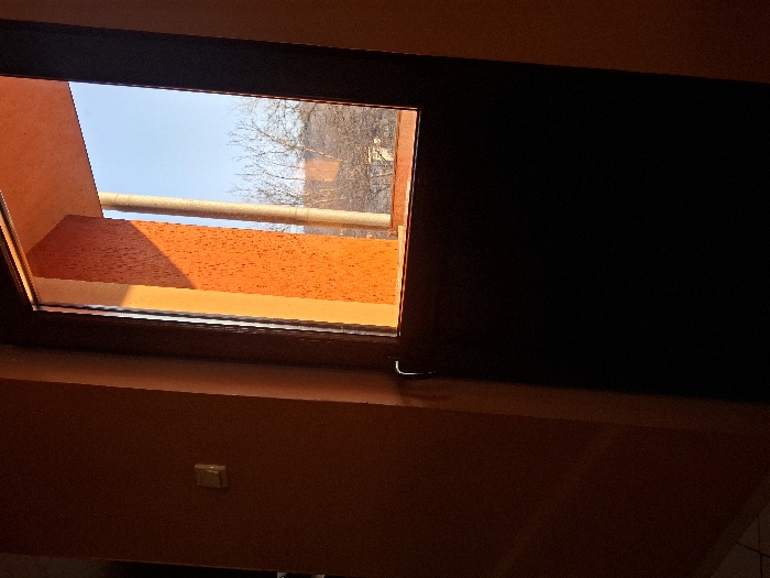 The image depicts an interior scene in the city of Pleven, Bulgaria, viewed through a partially opaque glass-paned door or large window. The interior wall on the left is reddish-orange with a textured finish, featuring a light-colored rectangular switch plate. Strong sunlight enters the room, illuminating parts of the interior and casting warm light on an exterior, textured orange wall visible directly outside the opening. To the right of this wall, a light-colored, vertical cylindrical pillar stands. Beyond these immediate exterior elements, a bare deciduous tree is visible against a clear blue sky. Faint architectural outlines of distant structures are discernible in the background, indicating an urban setting. The lower portion of the door/window is dark and opaque, with a subtle handle visible on the left edge of its frame. No human subjects are present in the scene.