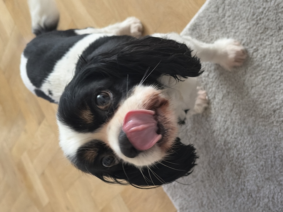 - "A tricolor Cavalier King Charles Spaniel, predominantly black and white with tan markings above its eyes, is depicted indoors in Varna, Bulgaria" by FM-3Yuas1, licensed under CC BY 4.0