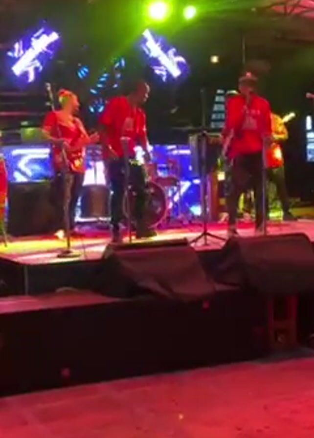 A band is performing on an outdoor stage at night. The band members are wearing red shirts and playing instruments including drums, guitars, and congas. There are two singers at the front of the stage. The stage is lit with colorful lights. There is a crowd of people watching the performance. There are speakers stacked on either side of the stage. The backdrop has a screen with visuals.