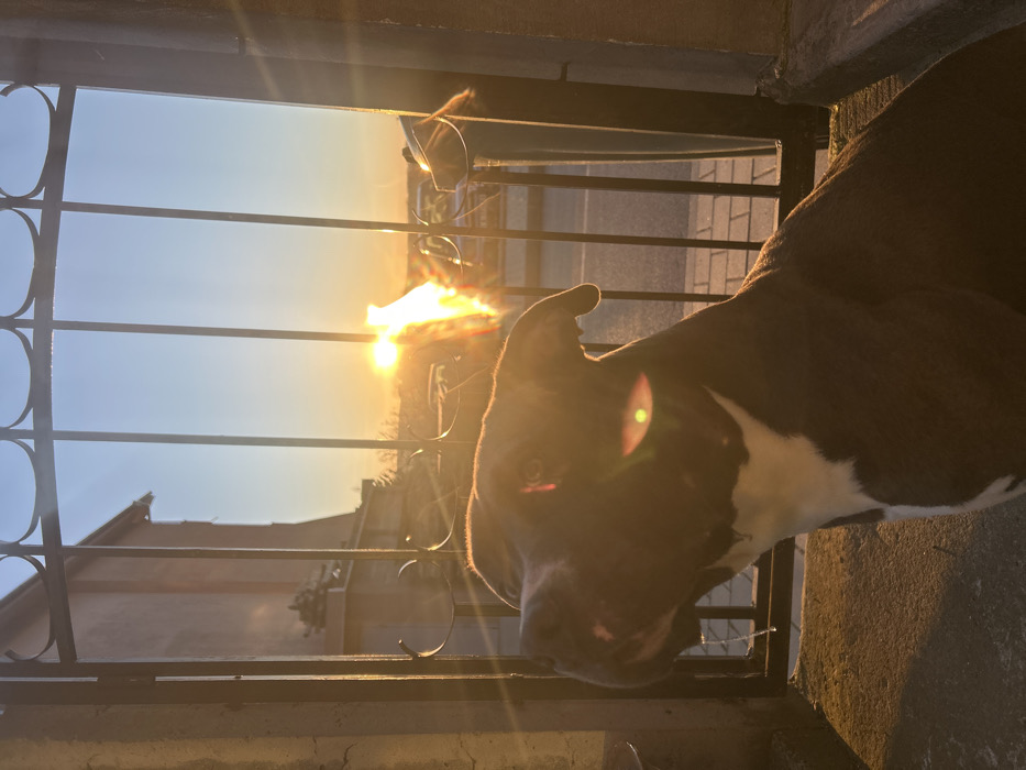 A dark brindle and white Pitbull-type dog is seated in the foreground on a concrete surface, facing slightly left and upwards, with its head tilted. A strand of saliva is visible dripping from its mouth. The dog's left eye is partially obscured by a prominent, circular lens flare from the sun. The animal is positioned in front of a dark metal gate with vertical bars and decorative scrollwork. Beyond the gate, a paved street with light-colored rectangular stones is visible. In the midground, a brilliant, intense sun flare dominates the horizon, indicating either sunrise or sunset. Several parked vehicles are discernible on the street beyond the gate. In the background, under a clear sky, distant buildings and faint vegetation are visible, bathed in the golden light of the low sun. The scene is located in Aheloy, Bulgaria.