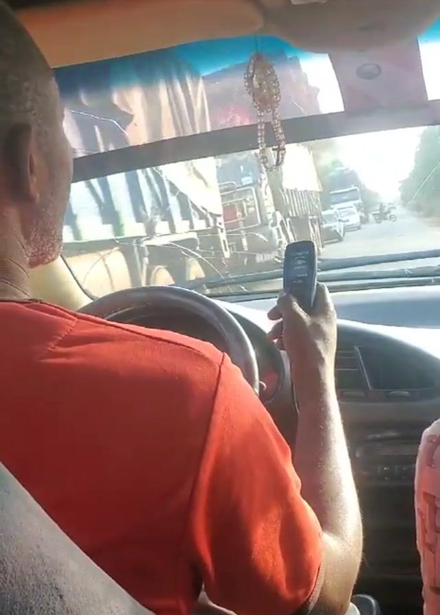 inside of a car with a man in the driver's seat. He is wearing a red shirt and is on the phone while driving. The phone is a small, older model with buttons. The road ahead has other vehicles, including large trucks. There's a beaded ornament hanging from the rearview mirror. The dashboard of the car is visible, and another person is seated in the passenger seat, partially visible. The windshield has a crack in it.