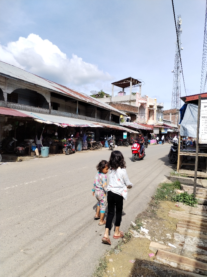 An outdoor, daytime image depicts a street scene in Mns Alue, Indonesia, under a sky with scattered white clouds. Two young children are prominently featured in the foreground, walking away from the camera on the asphalt road's right edge. The taller child on the right wears a white long-sleeved top, black leggings, and brown sandals. The shorter child on the left wears a light-colored patterned long-sleeved top and pants. To the left, a long line of buildings, primarily two-story structures with corrugated metal roofs, extends into the distance. The ground floor of these buildings hosts numerous market stalls or shops, covered by various awnings (red, striped, blue tarps), where multiple individuals (likely vendors and customers) are present. Several motorcycles are parked along this side of the road. Further down the street, a red scooter with a rider is visible, also moving away from the camera. In the background, a tall metal cell tower with antennae dominates the right side of the frame, and more distant buildings, including one with a distinctive pinkish, ornate facade, are visible. The immediate right foreground shows a dirt and grassy shoulder with some scattered debris, including wooden planks.