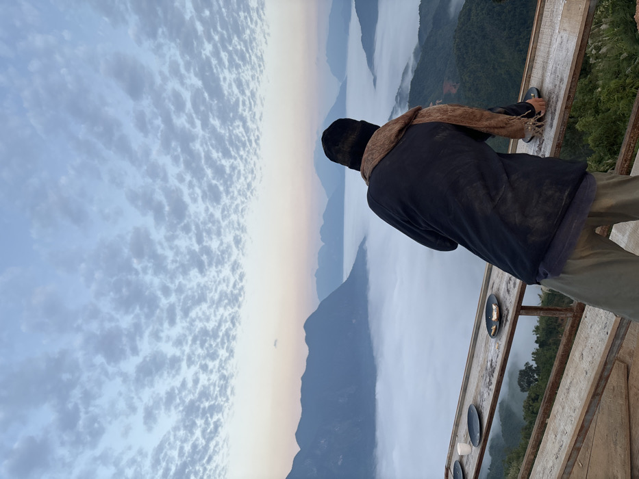 A person stands on a wooden structure, gazing at a mountain range veiled in mist and clouds. The sky is filled with puffy, textured clouds. The individual wears a dark jacket, a scarf, a hat, and light-colored pants. A wooden table with objects on it is visible on the structure. The overall scene is serene and scenic.