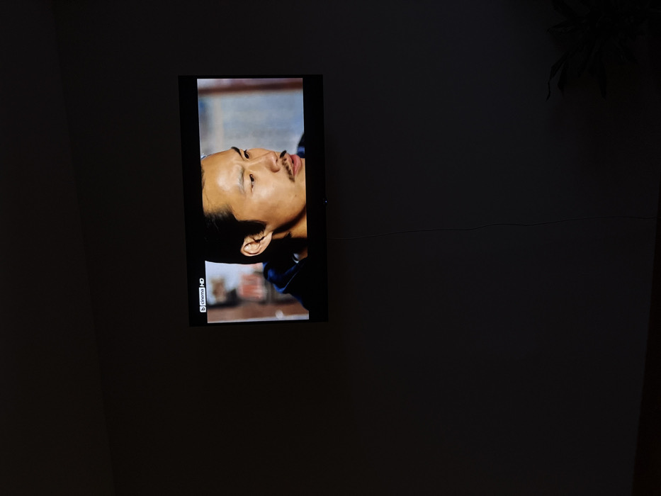 The scene depicts a television screen mounted on a dark wall in a dimly lit interior in Cherven Bryag, Bulgaria. The screen displays a close-up shot of an adult East Asian male with short, dark hair pulled back, a thin mustache, and a serious expression, looking towards the lower right of the frame. He wears a dark-colored garment. The "b cinema HD" channel logo is visible in the upper left corner of the television display. A thin, dark cable extends vertically downwards from the bottom center of the television along the wall. In the lower right foreground, a portion of a dark, leafy plant is visible. The floor beneath appears to be a dark, solid surface. No other individuals or significant objects are discernible in the dark environment.