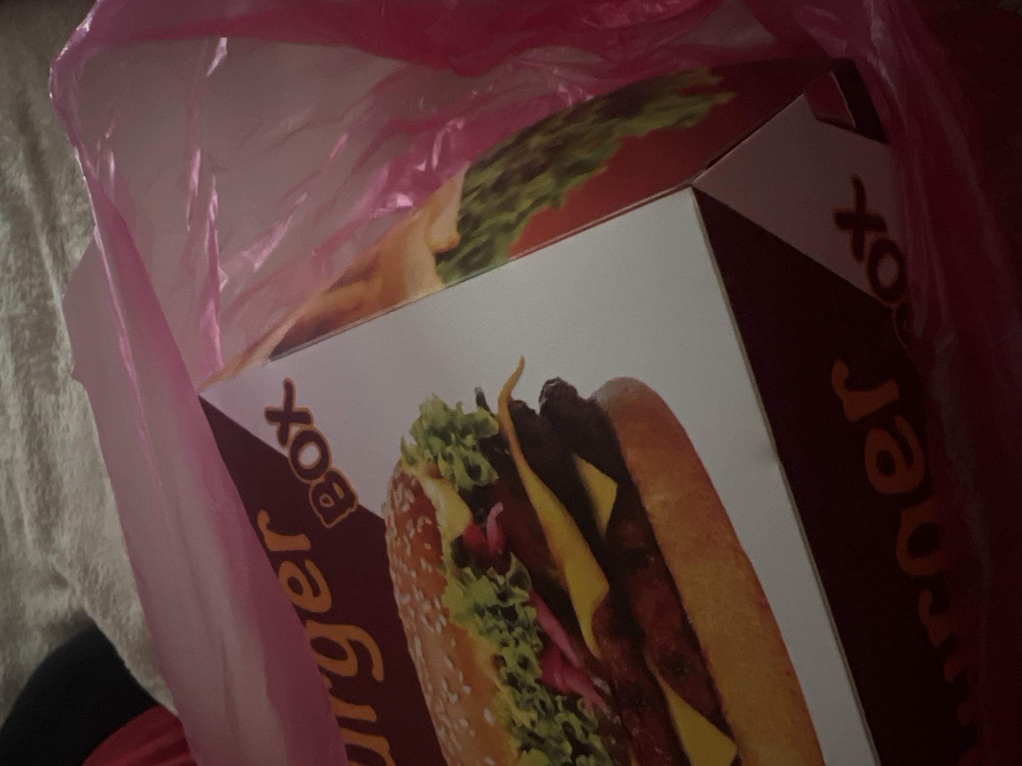 A partially obscured cardboard burger box is depicted, resting within a translucent, crinkled pink plastic bag