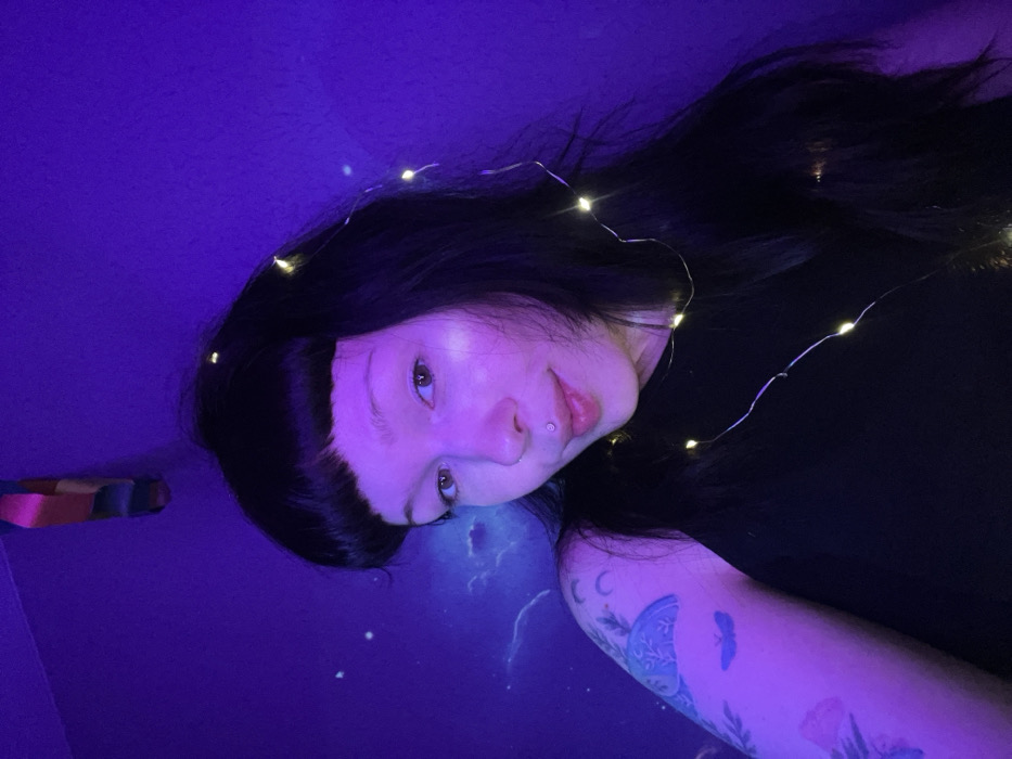 A young adult female is depicted in a close-up, chest-up portrait under predominant purple ambient lighting. She has fair skin, long dark hair with straight-cut bangs, and light-colored eyes. A small silver labret piercing is visible below her lower lip. She is wearing a dark, possibly black, sleeveless top. A string of warm white LED fairy lights is draped around her hair and right shoulder, with individual lights illuminated. Her left upper arm displays multiple tattoos, including celestial elements like crescent moons, a butterfly, and various floral or botanical designs in shades of blue and green. The background is a purple-illuminated wall featuring a faint celestial or cloudy pattern with scattered small white points resembling stars. A narrow multicolored ribbon or fabric strip hangs from the top left corner of the frame. The subject is looking directly towards the viewer with a slight smile. The specific location within Chaikovsky, Russia, cannot be determined from the visual information provided.