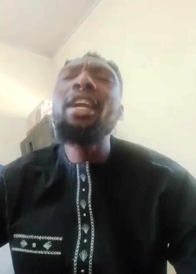 A man with dark skin and a beard is singing. He is wearing a black shirt with white embroidery on the chest. He is looking upwards. Behind him is a wall painted a light yellow color. There are some boxes stacked on a shelf in the background. The audio contains singing.