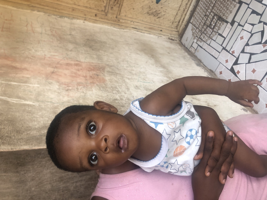 A young Black child lies on a pink surface, possibly a lap, and gazes upward with wide, expressive eyes. The child wears a white tank top with blue trim and sports-themed patterns. The background consists of a textured wall and decorative tiling. The child's dark skin contrasts with the light-colored clothing and background, creating a focal point on their face. An adult hand gently holds the child, providing a sense of comfort and security.