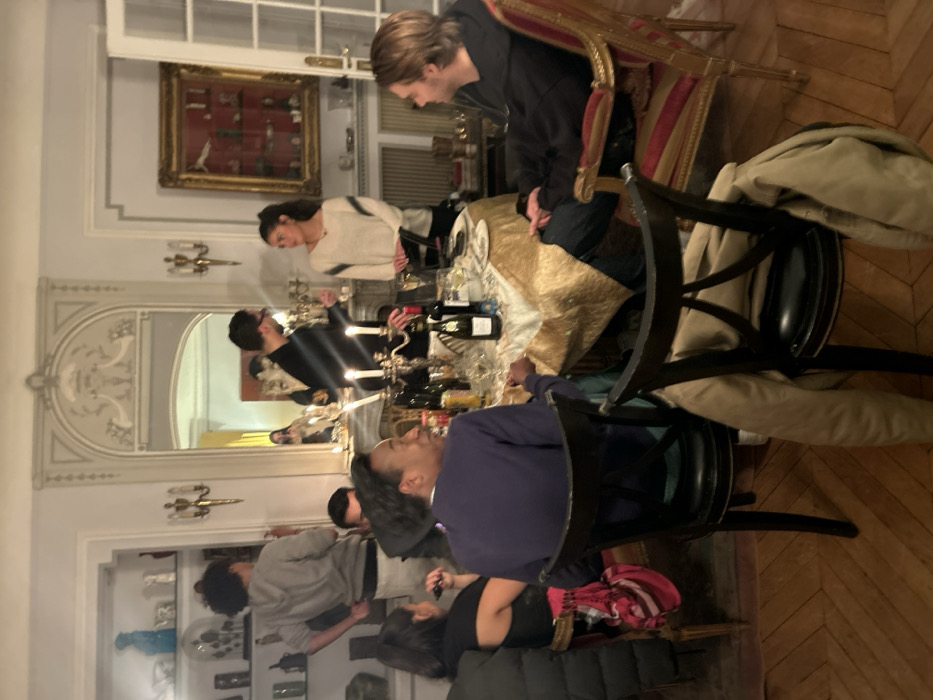 A dinner party is in progress. Several people are gathered around a table laden with food and drink, including wine bottles and candelabras. A person in a black hoodie sits near a gilded chair. A woman in a white sweater is seated to their left. A large mirror reflects the scene, showing more participants. Ornate wall decorations and a cabinet filled with objects add to the ambiance. A wooden floor completes the scene.