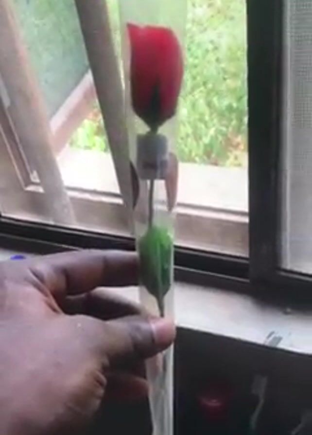 A hand holds a single red rose encased in clear plastic packaging near a window