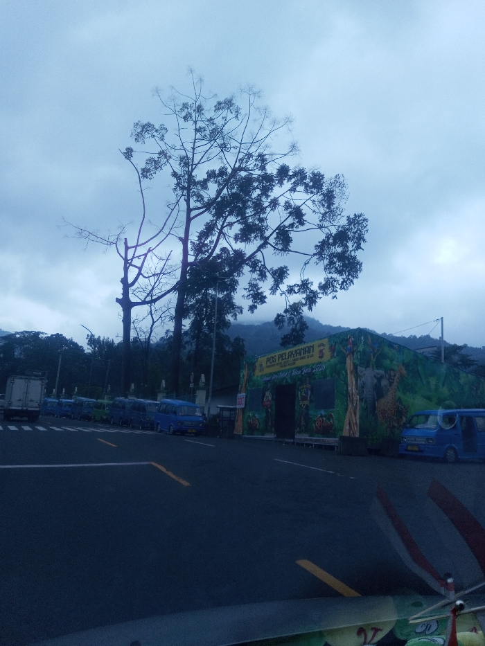 This image depicts an outdoor roadside scene under an overcast, dim sky with a blue-grey cast. The lighting is diffused and even. The prominent structure is a one-story building on the right, decorated with a jungle-themed mural featuring elephants, giraffes, and foliage. A yellow sign above its entrance reads "POS PELAYANAN" (Service Post) in red lettering. Below this, smaller text identifies "POLRES JOMBANG" and "POLSEK NGORO," indicating the location is in Jombang, East Java, Indonesia, specifically related to local police services. In front of this structure and extending down the road, a line of at least seven blue microbuses or vans is parked parallel to the road. Further down the road on the left, a white box truck is partially visible. The road itself is asphalt, marked with white and yellow lines. Several large trees with dense foliage are visible in the midground and background, alongside a tree with fewer leaves, possibly partially bare or pruned. Distant hills or mountains, partially obscured by haze or clouds, form the backdrop. No individuals are visible. The lower right foreground shows a partial view of a dark surface and some reflective elements, likely from the vehicle from which the photograph was taken.