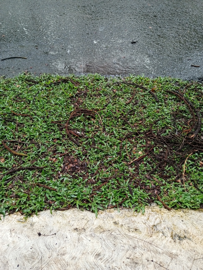A patch of lush green grass sits between a gray asphalt surface above and a textured concrete surface below. The grass is covered in brown, string-like debris, possibly plant matter. Water droplets are visible on the asphalt, suggesting recent rain. The concrete surface features a repeating wave pattern, adding visual texture.