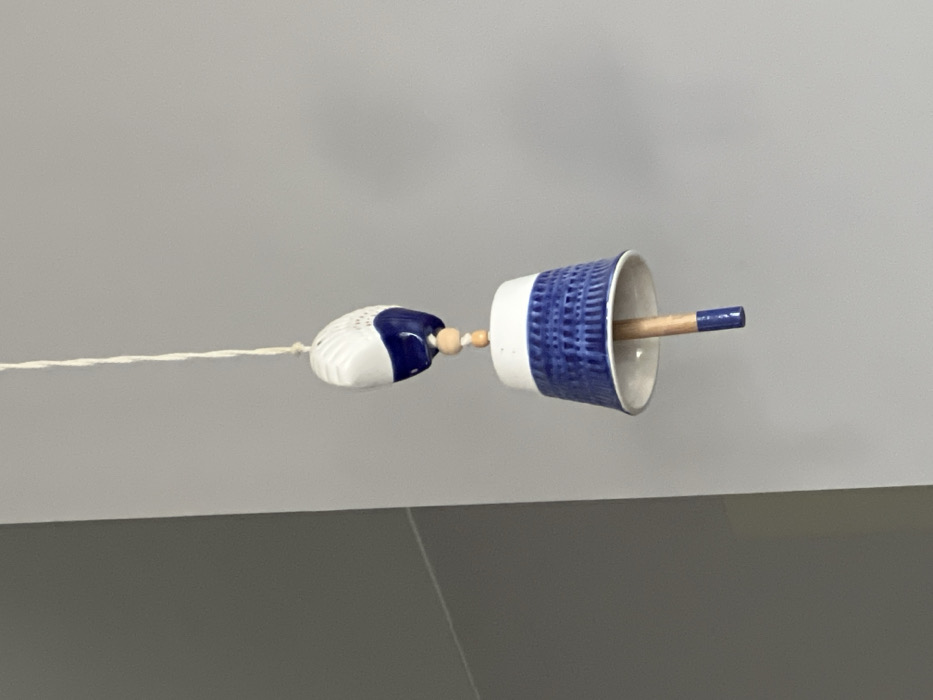 A ceramic decorative hanging ornament is suspended against a light gray wall background within an interior space in Rafailovići, Montenegro. The object hangs vertically from a twisted white string. The top component is an inverted, white ceramic seashell with a dark blue painted base and subtle surface ridges. Below this, two small, spherical light-colored wooden beads are present. The primary element is an inverted, bell-shaped ceramic piece, featuring a white upper band and a textured, dark blue lower section. A light-colored wooden rod, acting as a clapper, extends from the interior of the bell, with its lower tip painted dark blue. To the left of the ornament, a darker gray vertical surface is visible, separated by a diagonal line. No individuals, actions, or interactions are depicted.