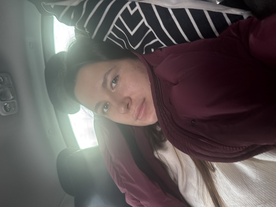 A female individual is depicted in the rear passenger compartment of a vehicle. The subject is a woman with fair skin, dark hair, and a neutral facial expression, looking directly into the camera. She is wearing a light-colored, possibly cream, ribbed long-sleeved top underneath a dark red or maroon puffer jacket, which is partially zipped. Her dark hair is visible around her face and shoulders. To the left of the subject, a dark car seat headrest is partially visible. To the right, a black and white striped item, consistent with a textile object like a pillow or blanket, is present. The vehicle's interior ceiling, including an overhead light fixture, is visible at the top of the frame. Bright natural light emanates from the rear window, preventing identification of external surroundings. The precise location within the city of Moskva, Russia, is not discernible from the image's content.