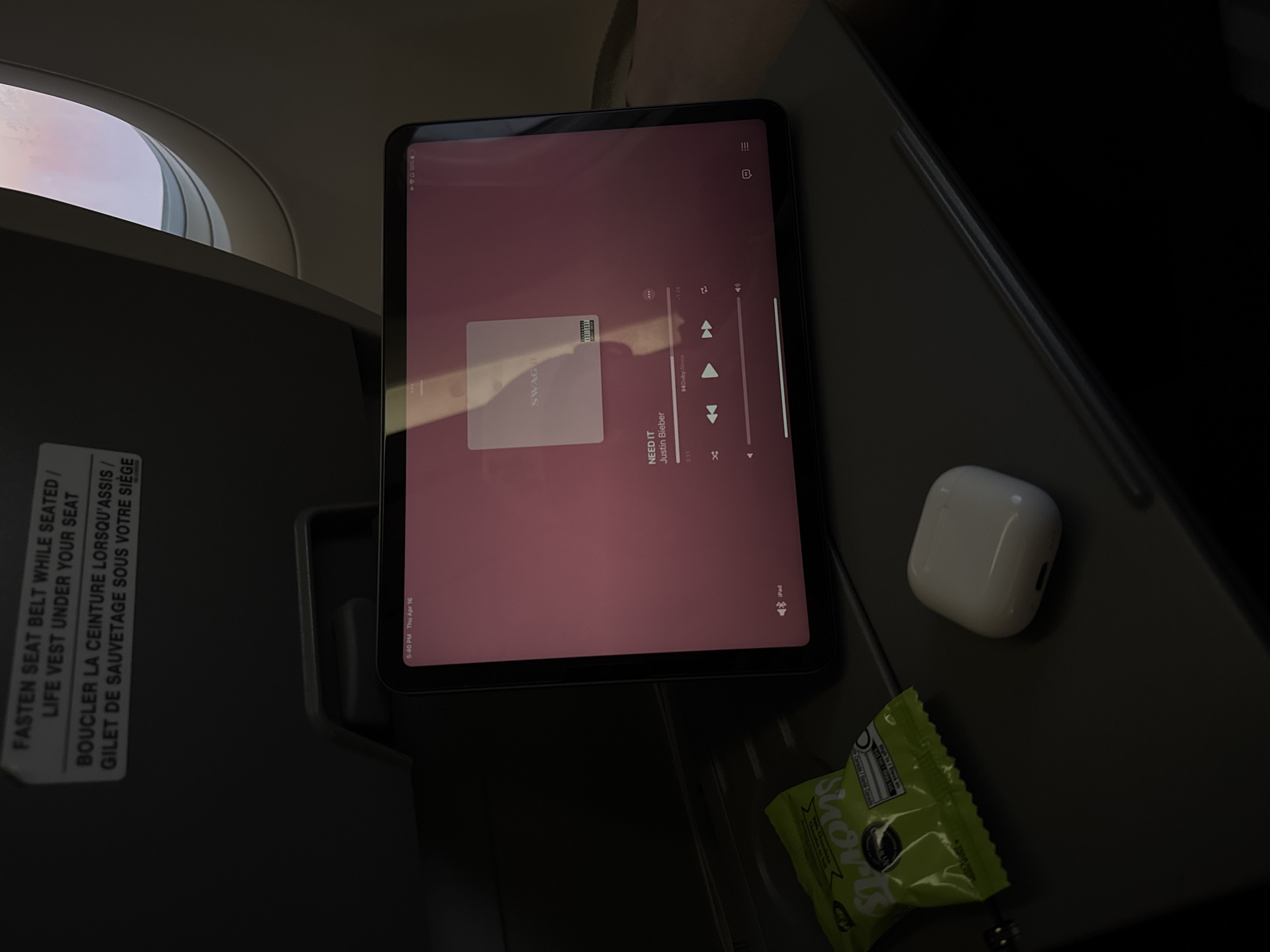 A tablet on a tray table displays the album art for "SWAG" and the song "NEED IT" by Justin Bieber in the music app