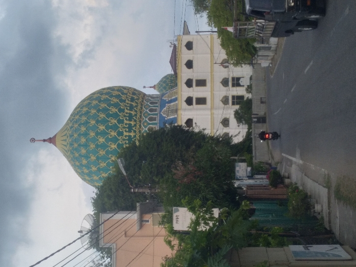 The image displays the Islamic Center Lhokseumawe, Indonesia, under an overcast sky