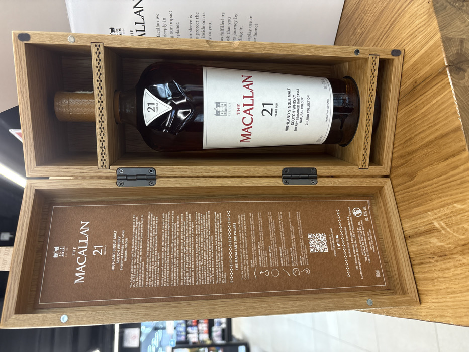 The scene depicts a bottle of The Macallan 21 Years Old Highland Single Malt Scotch Whisky displayed in its open, light-brown wooden presentation box