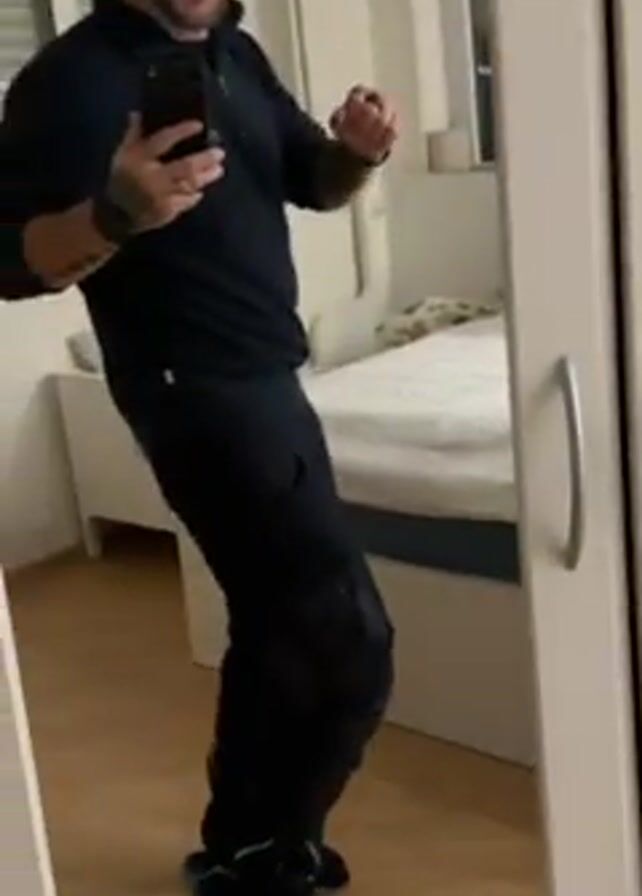 A man with glasses, a black hooded shirt, and black pants is filming himself in a bedroom mirror. He has tattoos on his arms. The room has a bed, a nightstand, and a window. The man is dancing and recording himself.