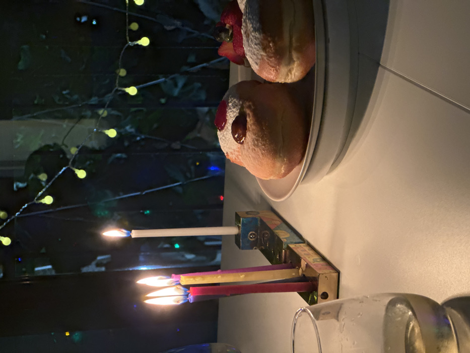 - "The image features a Hanukkah menorah with lit candles of various colors, placed near a plate of sufganiyot" by FM-5V1Jf1, licensed under CC BY 4.0