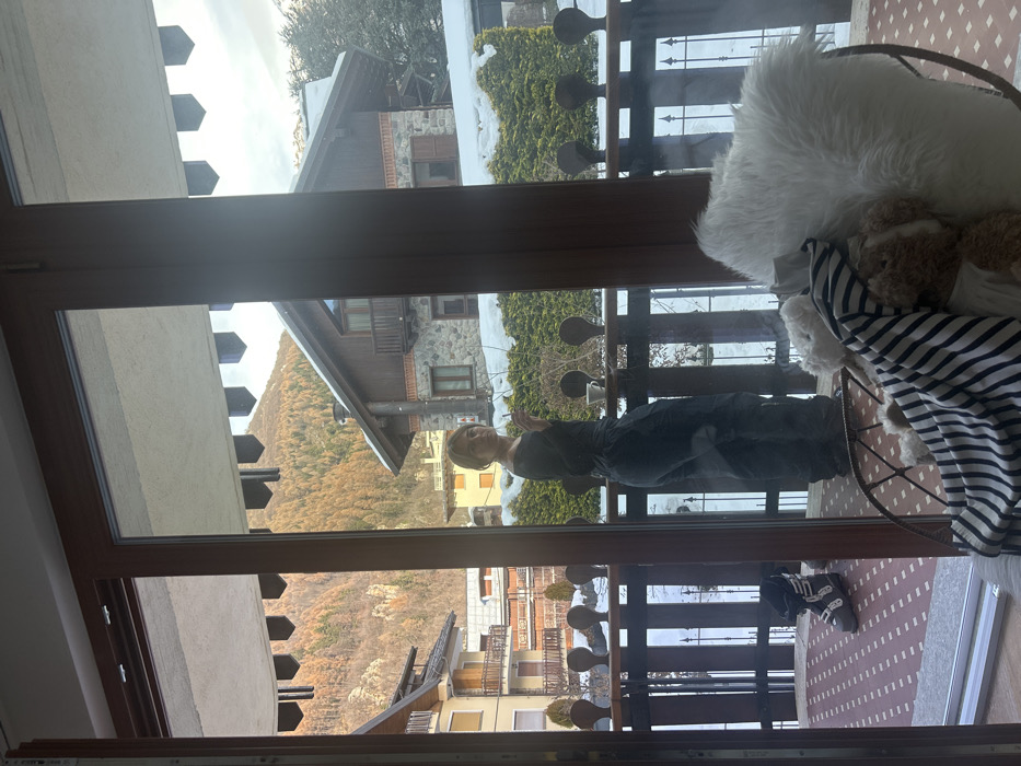 The scene depicts a winter landscape in Limone Piemonte, Italy, viewed from inside a room looking out onto a snowy balcony through large glass doors. In the immediate foreground, to the left, a portion of an open glass door reveals a red-patterned outdoor mat on the balcony floor. A single black and white ski boot rests on this mat, oriented towards the right. To the right, a metal-framed chair holds a white faux fur throw, partially covering a brown teddy bear wearing a striped shirt. In the midground, on the balcony, a light-skinned female individual stands facing away from the camera, turning her head and torso to look over her left shoulder towards the viewer. She has short, light brown hair and is dressed in a dark, possibly off-the-shoulder, long-sleeved top and dark trousers. Her left hand is raised, holding a small, slender cylindrical object. To her right, a white cup is placed on the wooden balcony railing, which features decorative, pointed vertical elements. Snow covers the ground beyond the railing. A dense green hedge, partially covered in snow, spans horizontally behind the railing. The background reveals an alpine village setting. Several buildings are visible, including a prominent two-story house with a stone lower facade, wooden upper walls, a dark pitched roof, and a wooden balcony, partially covered in snow. Another multi-story building with balconies is visible further to the left. Beyond the village structures, snow-dusted, forested mountains with trees displaying orange and brown autumnal or winter foliage rise under a bright sky, suggesting clear daylight conditions.