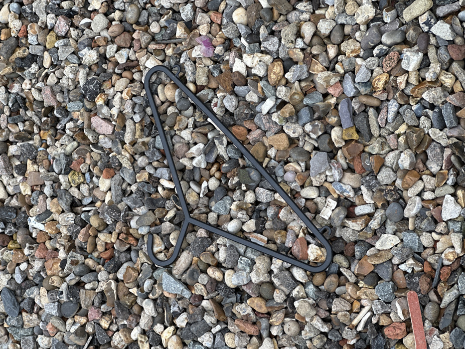 An overhead view reveals a matte black, rigid, open-frame object, approximately 30-40 cm in length, resembling a modern clothing hanger with a triangular profile and rounded corners. The object rests diagonally on a surface composed of mixed gravel, comprising multi-colored pebbles and crushed stone varying in size from approximately 1 cm to 5 cm in diameter. The gravel displays natural tones including grey, brown, white, black, and reddish-brown. Incidental debris is present within the gravel: a reddish, flat rectangular fragment is partially visible in the lower-left corner, alongside scattered small white fragmented pieces. A small white plastic piece is embedded near the bottom right curve of the black object, and a small, irregular purple fragment is visible in the upper right quadrant of the gravel. No individuals, animals, or active human interactions are depicted. The scene is located in Epping Forest, United Kingdom.