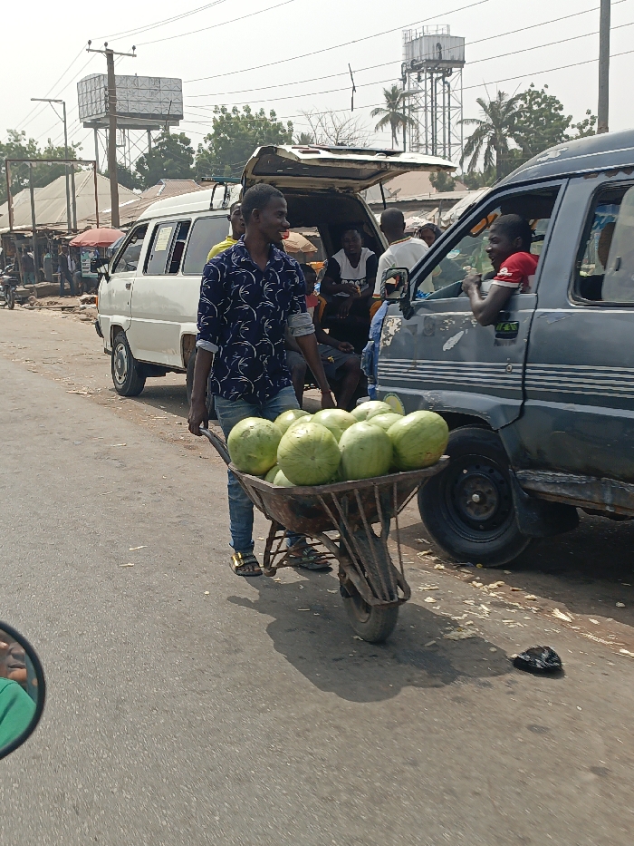 A man pulls a wheelbarrow loaded with watermelons on a paved road. He wears a patterned shirt and jeans with sandals. Beside him, a grey van has people inside, and someone is speaking to the man. A white van with an open back is also visible, along with other individuals standing around. Water towers stand in the background. The scene takes place on a sunny day at what appears to be a market.