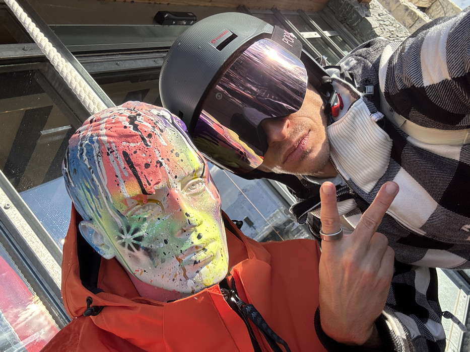 A selfie shows a person wearing a grey ski helmet and mirrored goggles, giving a peace sign. Next to them is a mannequin head covered in splattered paint, wearing an orange jacket. The person is wearing a black and white checkered jacket over a white turtleneck. The background reveals the corner of a building with a white rope in the upper left corner. The scene appears to be outside on a sunny day.