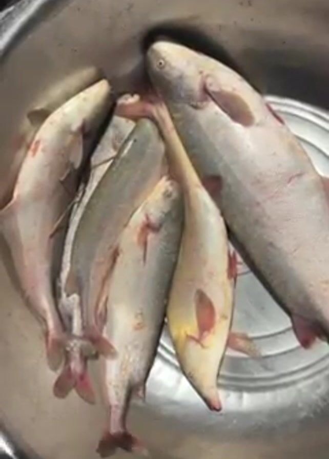 metal bowl containing six fish. The fish are light gray, some with reddish marks or fins, and one is slightly yellowish. They vary in size, with one being notably larger than the others. The bowl is sitting on a dark surface. No people are visible in the video. There are sounds of voices speaking in a language other than English in the background.