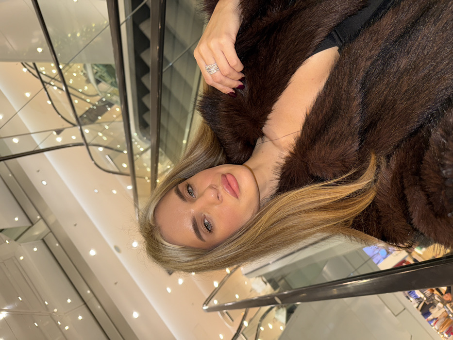 The image displays a fair-skinned female, estimated to be between 20 and 30 years of age, with long, straight, light brown hair and light-colored eyes. She is centrally positioned, looking directly into the camera with a neutral expression, consistent with taking a selfie. She is wearing a dark brown fur or faux-fur coat, open to reveal a dark garment underneath, likely a top or dress. Her left hand, adorned with multiple stacked silver-toned rings and dark-painted fingernails, is visible near her left shoulder. The background features the brightly lit interior of a large, multi-story department store, identifiable by its numerous escalators with glass balustrades, dark treads, and a high white ceiling equipped with an array of recessed circular lights. This architectural design is characteristic of the KaDeWe (Kaufhaus des Westens) department store located in Berlin, Germany. Blurred retail displays are partially visible in the lower left portion of the frame.