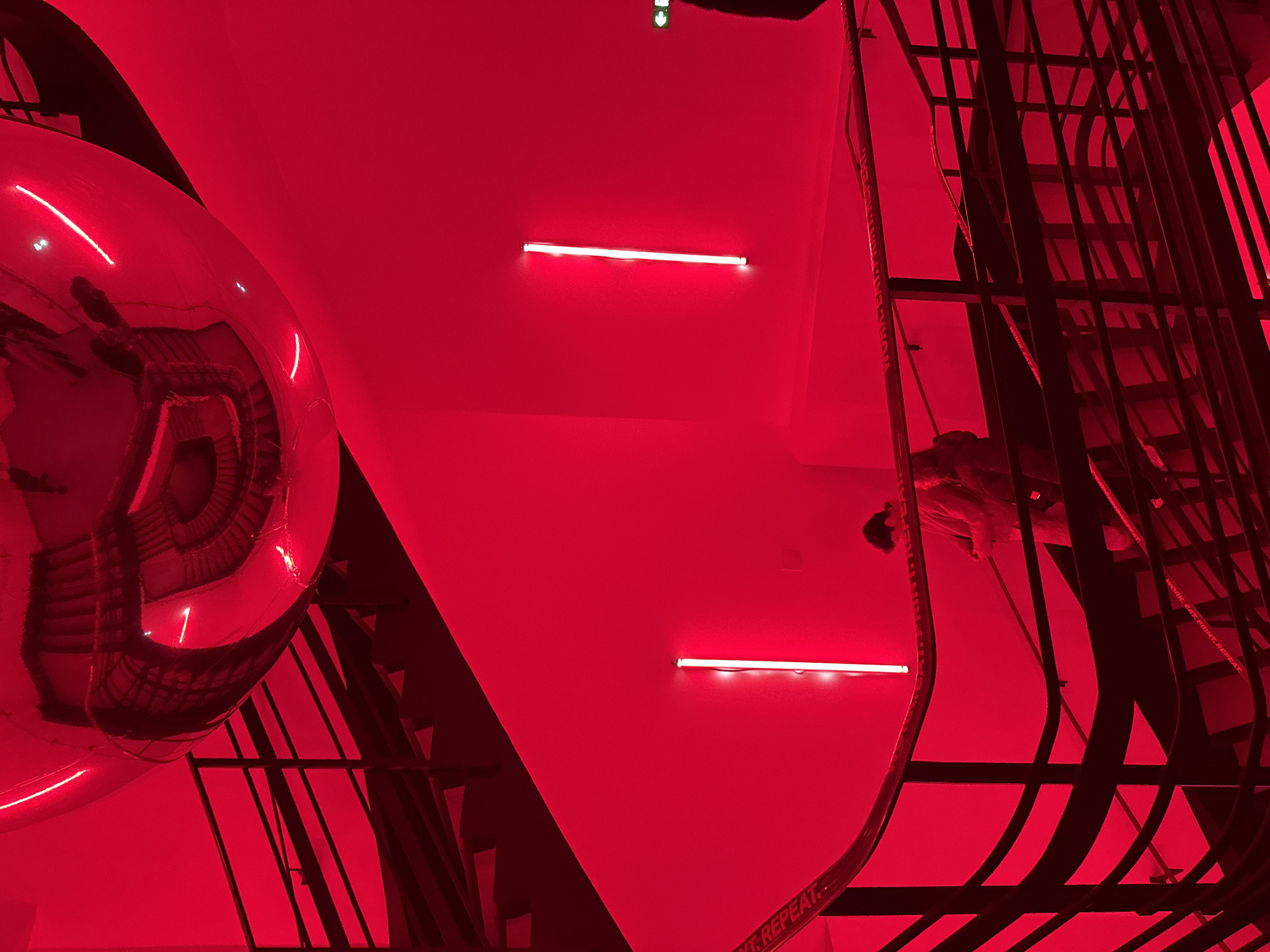 The image, bathed in a uniform red light, features an interior scene of what appears to be an art installation in Paris, France. A large, spherical reflective object dominates the left side, showing distorted reflections of the surrounding structure. In the background, two linear light fixtures illuminate a flat, geometric wall. To the right, a ladder-like structure extends vertically, and a safety lanyard with text "WORK. EAT. PRINT. REPEAT." is partially visible. A figure is present, but obscured by the lighting.