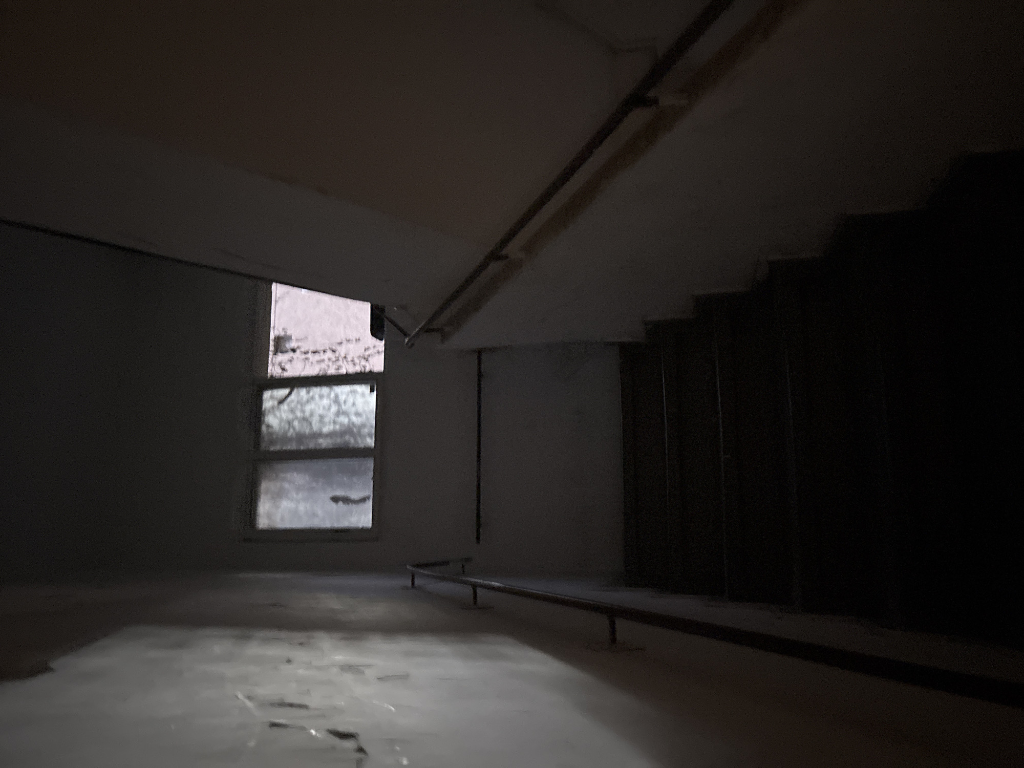 The image displays an interior stairwell within a building in Tel-Aviv, Israel. The scene is dimly lit, viewed from a low vantage point looking upwards along a flight of stairs. The staircase features dark-colored treads and risers, becoming increasingly obscured by shadow towards the bottom of the frame. Both the left and right walls are light-toned. The left wall exhibits significant surface wear, characterized by scuff marks, discoloration, and potential plaster damage or peeling paint. A dark metal handrail, supported by multiple brackets, runs along this wall. The right wall also has a dark metal handrail, and beneath it, a distinct yellowish-brown discoloration or stain extends horizontally. At the top of the visible staircase, a multi-pane window allows indirect natural light to enter. The window glass appears frosted or dirty, obscuring a clear view but revealing blurred shapes consistent with exterior foliage or tree branches against a lighter background. A faint, elongated dark silhouette is discernible against the lower left pane of the window. A strong, localized artificial light source illuminates a bright, vertical strip on the upper section of the left wall. No individuals, animals, or distinct non-architectural objects are present within the scene.