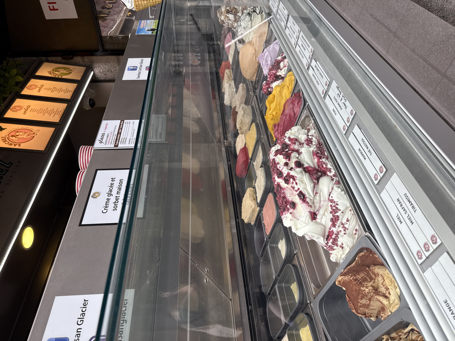 A display case showcases a variety of ice cream flavors, including tiramisu, miel safran, marron, and other fruity and creamy options