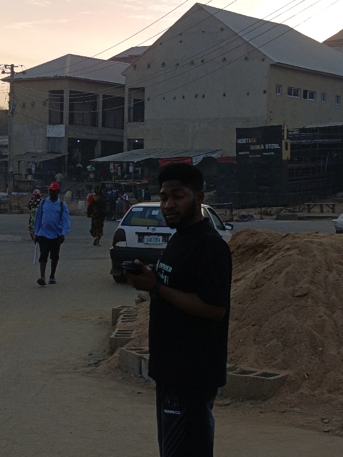 A man in a black t-shirt and dark pants holds a phone on a dusty street. Behind him is a white car with a license plate, a sand pile, and stacked concrete blocks. Other people are walking nearby. In the background are two large buildings with metal roofs, one with a sign reading "Heritage Iron & Steel". The sky is light and overcast. The overall scene suggests a street in a less developed area.