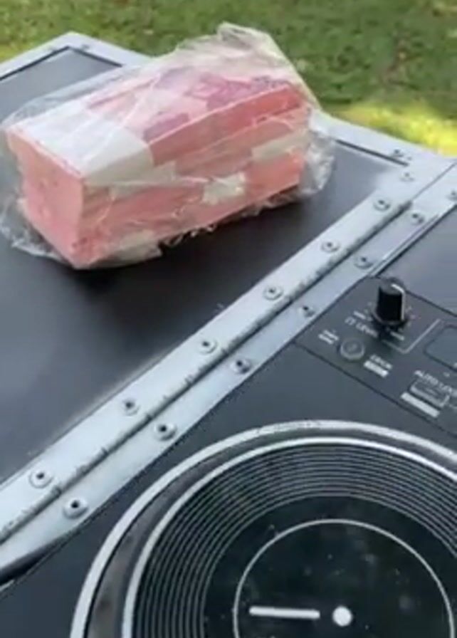 Here's a detailed description of the video: The video shows a DJ setup outdoors, likely at an event. There's a stack of money wrapped in plastic sitting on top of a black DJ controller case. The DJ equipment includes a black mixer with knobs and a turntable, along with a Macbook Pro positioned above it on a stand. The DJ controller has "SERATO DJ" printed on it. The camera then pans to show an outdoor setting - a grassy lawn with trees in the background. People are visible in the distance, standing on a white sheet decorated with rose petals and balloons. The reflection on the Macbook Pro screen hints at what the people are doing. The video suggests the DJ is hired for an event taking place in a park-like setting.