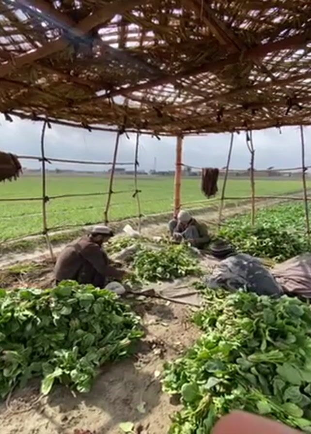 three men sitting under a simple thatched-roof structure in a field. They are surrounded by piles of green leafy vegetables, and appear to be sorting or processing them. The men are dressed in warm clothing, suitable for the weather. Beyond the structure, the field extends into the distance, with a few buildings visible on the horizon under a cloudy sky.