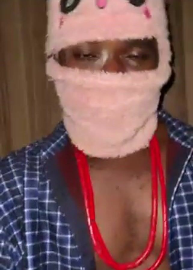 An adult man is looking at the camera with a somewhat confused expression. He is wearing a pink panda ski mask with the face stitched on, a red necklace with two loops around his neck, and a blue and white plaid shirt, unbuttoned to reveal his chest. The background is out of focus, but a light brown wall can be discerned. The man briefly holds up two fingers in a peace sign. Music is playing in the background.