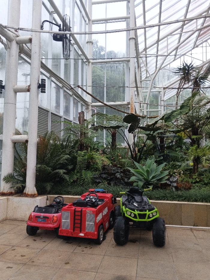 - "Inside a greenhouse filled with lush ferns and tropical plants, three children's ride-on toys are parked" by FM-s6Mf43, licensed under CC BY 4.0