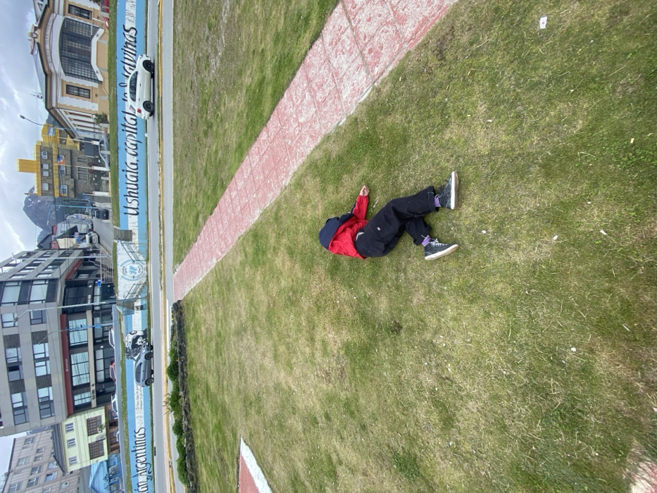 A person wearing a red jacket, black pants, purple socks, and sneakers lies prone on a grassy area. A red-tiled path is next to the grass. The backdrop includes a city street with buildings, cars, and a painted wall that says "Ushuaia, capital". In the far background, mountains are visible. The photo appears to be taken at an unusual angle.