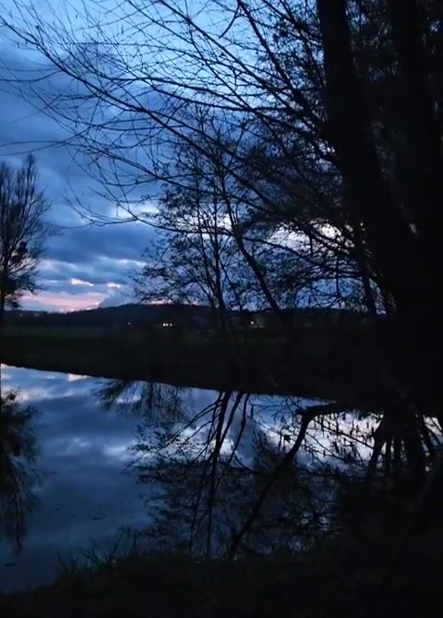 tranquil scene at twilight, featuring a body of water reflecting the evening sky and the silhouettes of trees. The sky is a mix of blue and gray clouds, with a hint of light on the horizon. The trees are bare, their branches reaching upwards, and their reflections are clearly visible in the still water. The camera pans slightly, offering a wider view of the pond and the surrounding landscape. The overall mood is calm and serene, with the darkness of the foreground contrasting with the brighter sky reflected in the water.