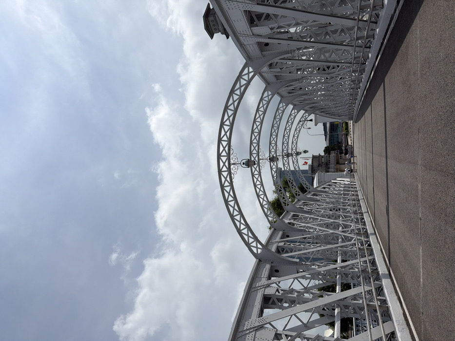 - "A low-angle shot of a white, arched bridge, its intricate steel framework prominently displayed against a sky filled with scattered clouds" by FM-raOO93, licensed under CC BY 4.0