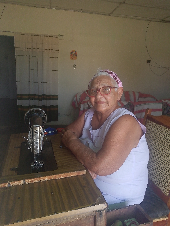 An elderly woman with red glasses and a pink headband sits at a wooden sewing machine